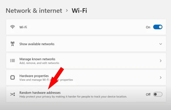 - Bước 2: Trong Wifi setting ==> mục “Random hardware addresses”, chọn “Off”.