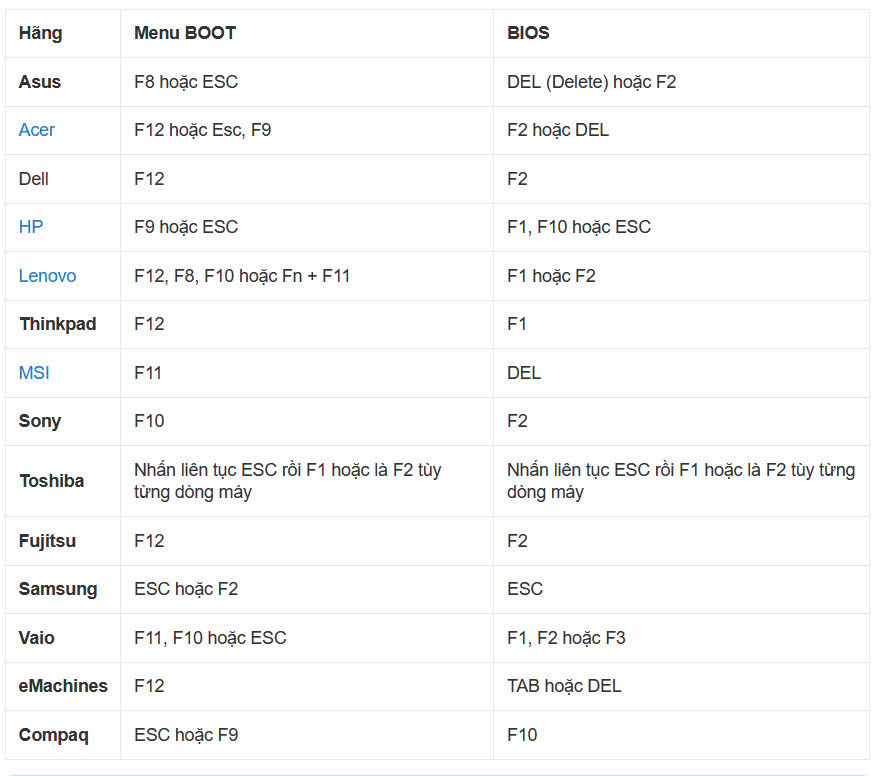 Dưới đây là hướng dẫn truy cập BIOS và Menu Boot trên các dòng laptop phổ biến.