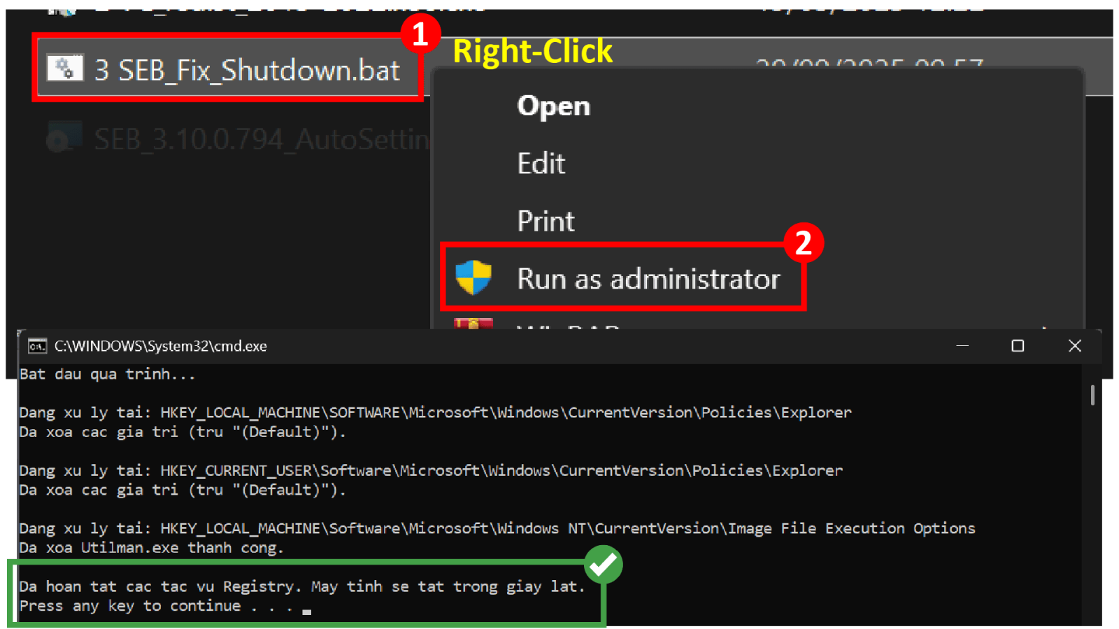• Bước 1: Chạy file SEB_Fix_Shutdown.bat