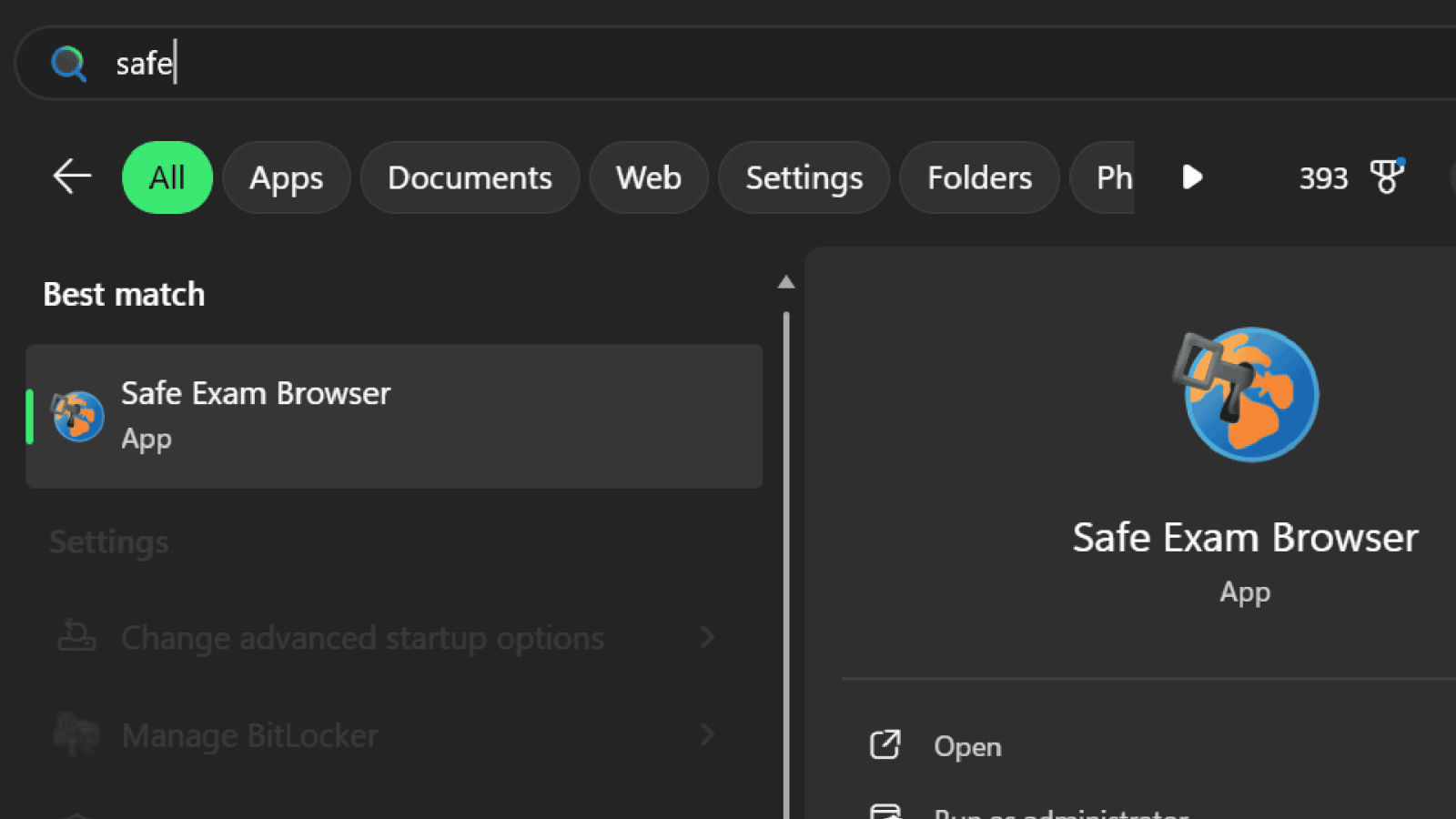 To open Safe Exam Browser, please search for the keyword “Safe” instead of “SEB”.